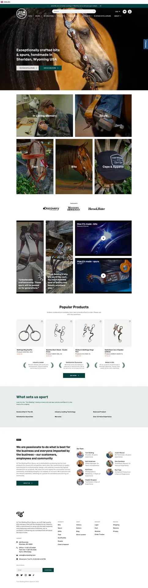 Tom Balding Bits & Spurs is a heritage equestrian brand rooted in the legacy of master bit maker Tom Balding. Known for precision craftsmanship and premium quality, the company designs and manufactures custom bits, spurs, and related horse tack that blend traditional hand-forging techniques with modern performance standards. With decades of experience and a reputation for durability and rider-centered design, Tom Balding Bits & Spurs serves serious riders, trainers, and collectors who value authenticity, comfort, and enduring performance in every piece of equipment.